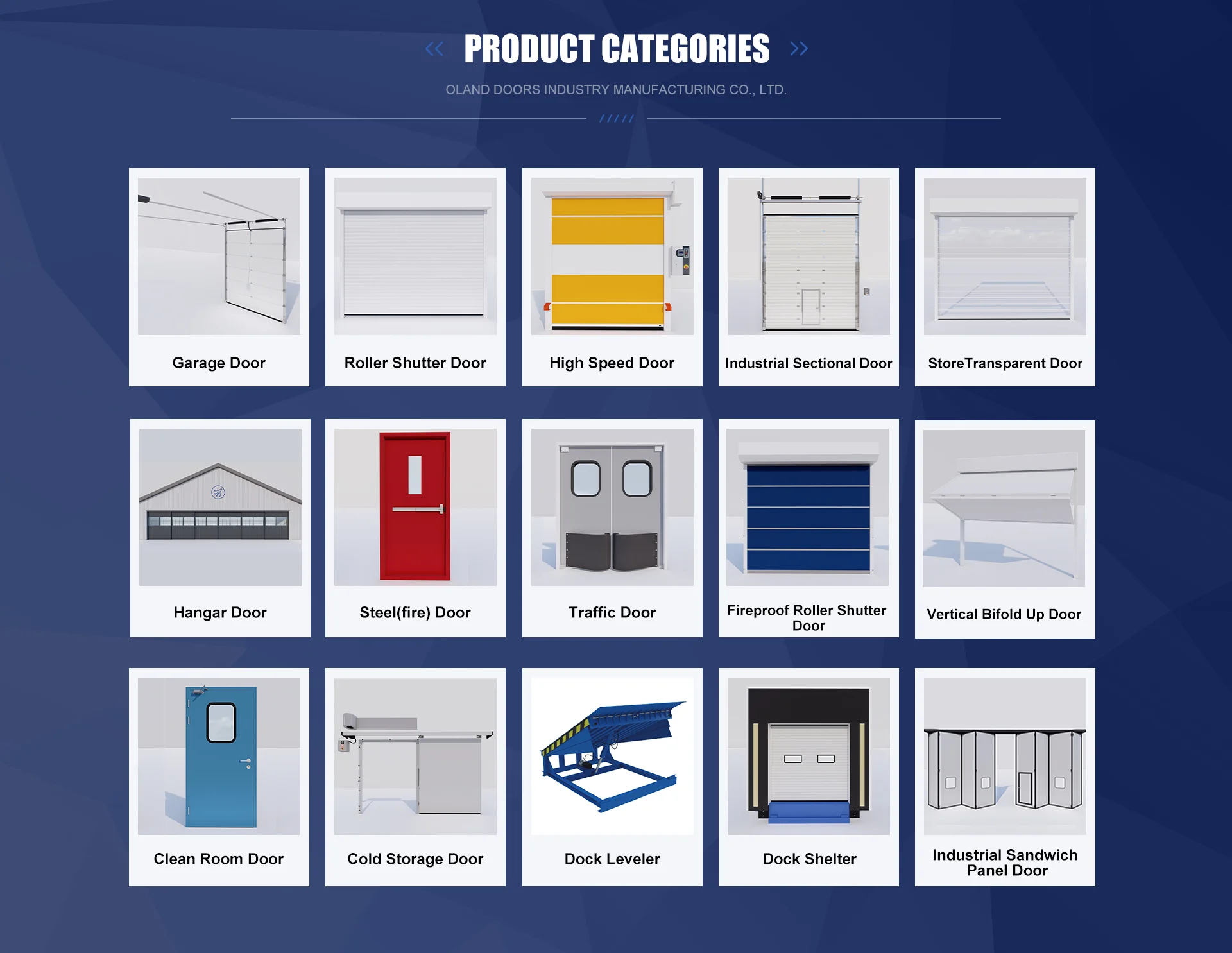 We provide sectional doors, roller shutter doors, high speed doors, hangar doors, dock shelters and dock levelers for factories, logistics systems and industrial and commercial scenarios. The products are made of galvanized steel/ aluminum alloy profiles, integrated with safety collision avoidance and intelligent control, taking into account durability and operational efficiency. Support customized size/opening mode to optimize space utilization and sealing performance. The loading platform is equipped with an adjustable lip, which is suitable for docking with multiple vehicles.